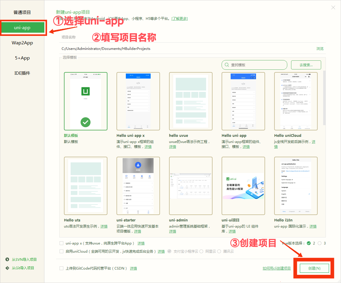 - 项目类型选择uni-app,填写好项目名称后点击创建