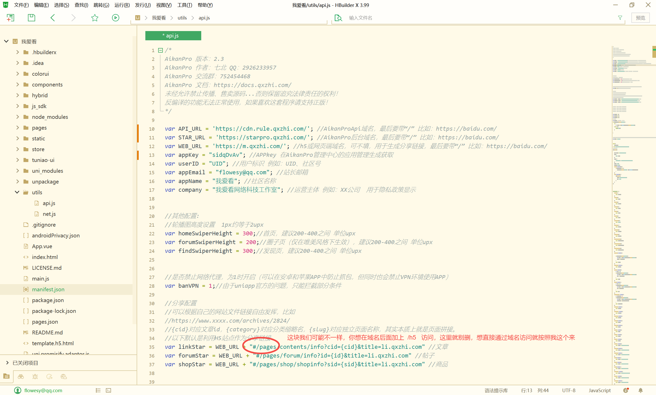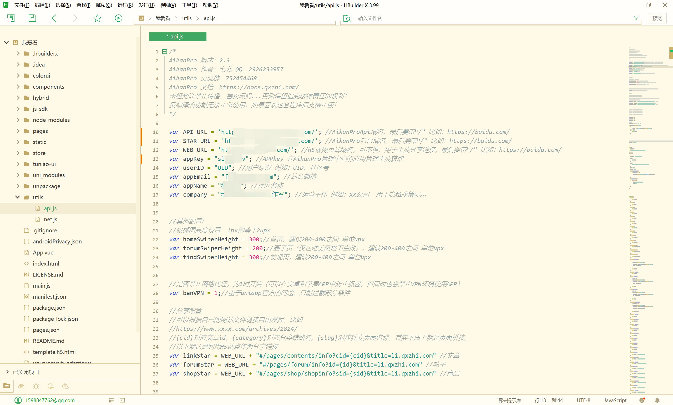 - 打开项目目录下的utils/api.js文件,根据提示填写AikanProApi域名、AikanPro后台域名、APPkey信息等等