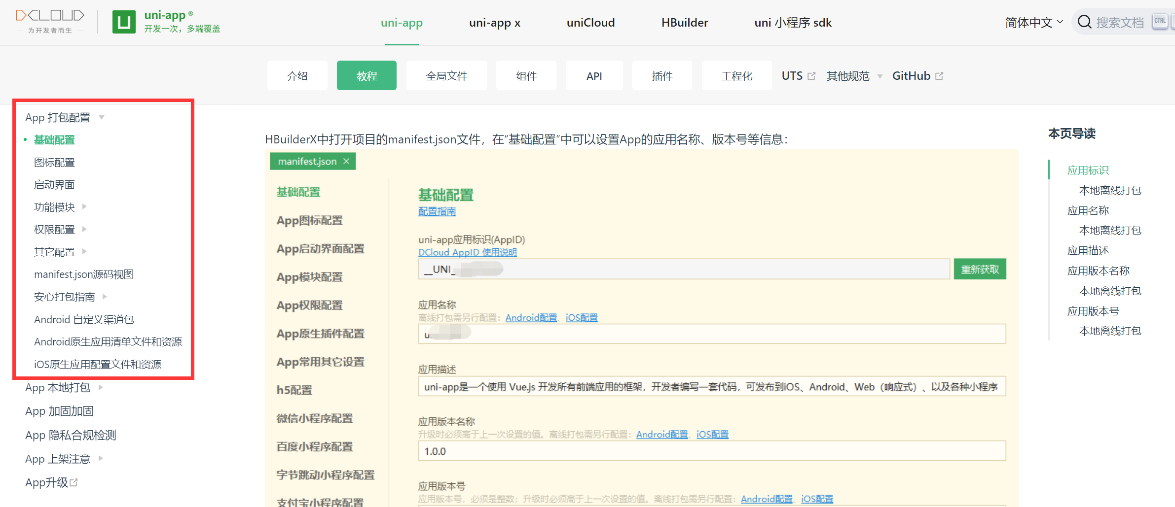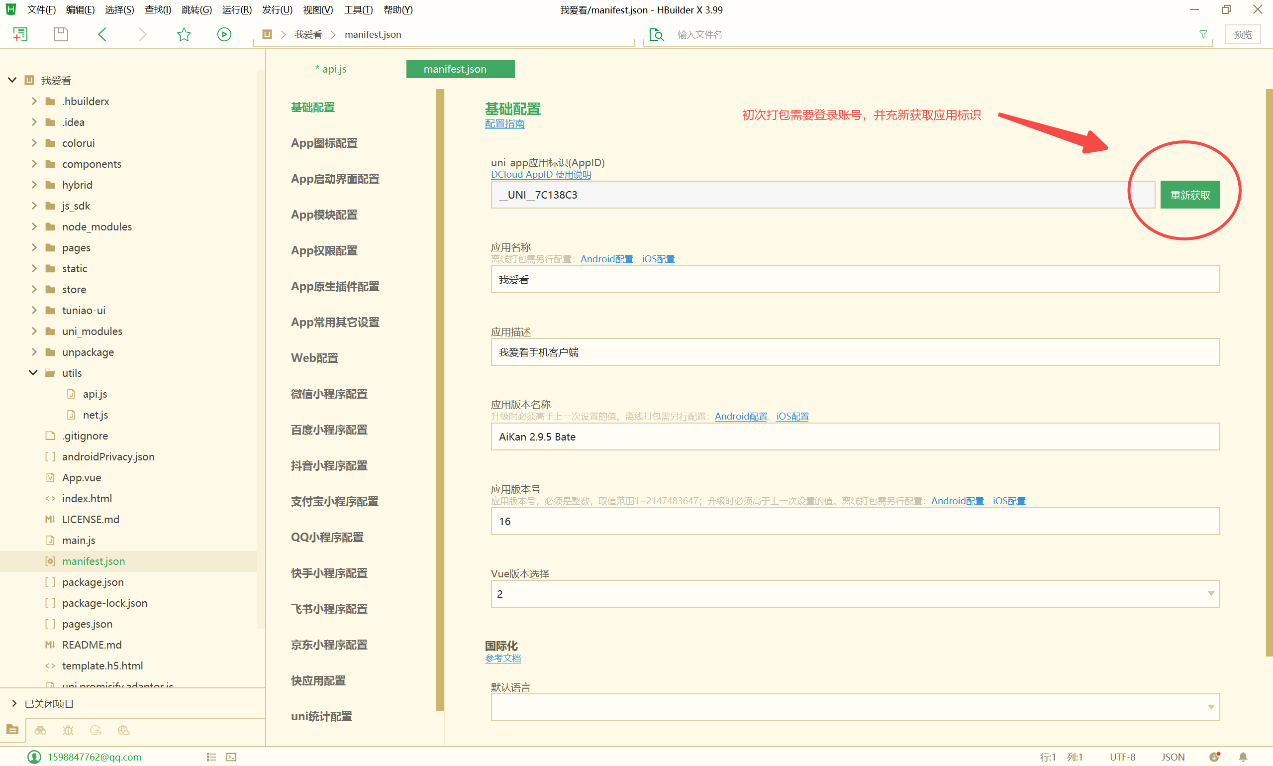 - 双击项目目录下的manifest.json文件,弹出应用基础配置信息,进行一些应用的基本信息配置(若初次打包需要重新获取uni-app应用标识)