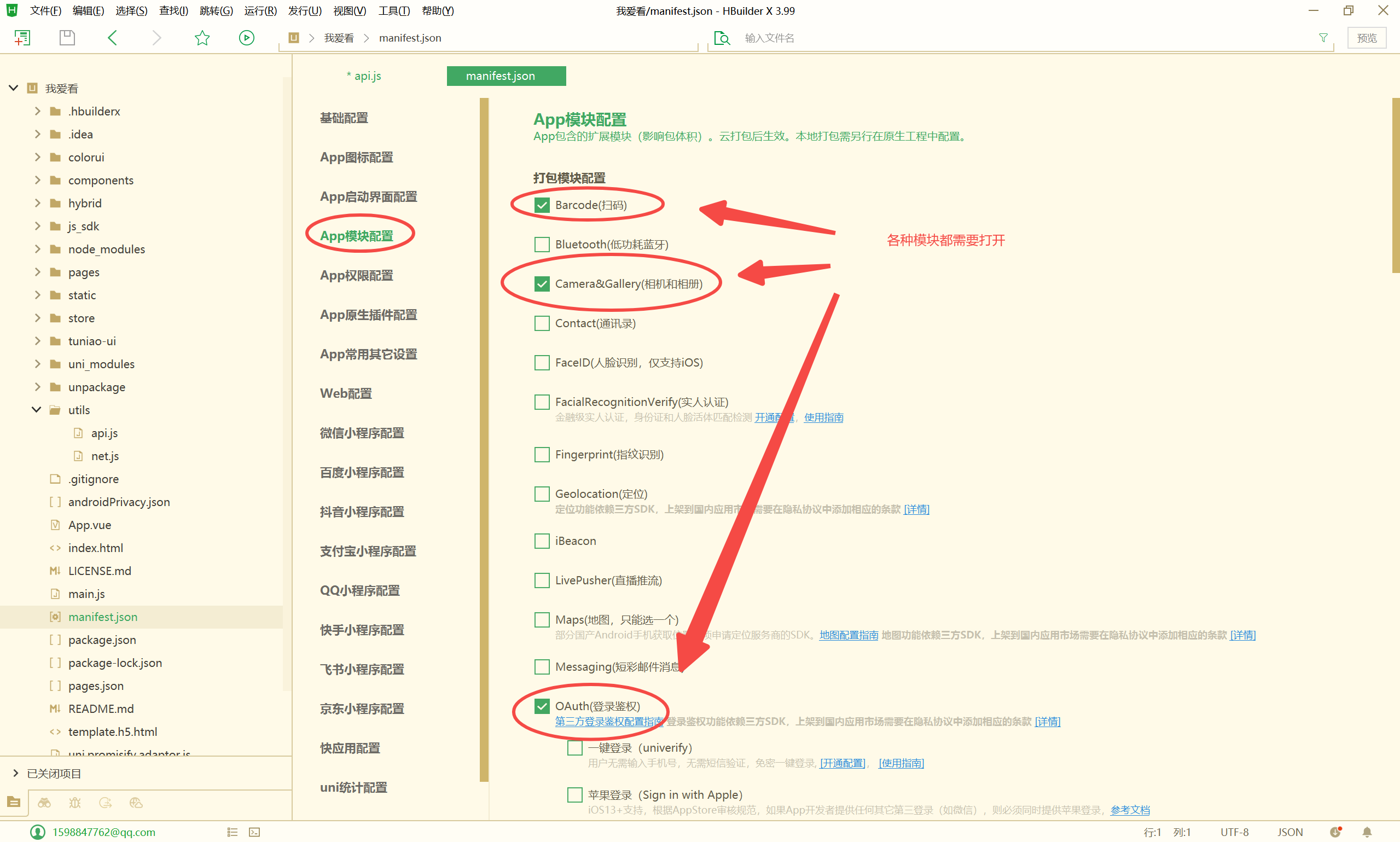- APP模块配置勾选:扫码,相册,Push,Share,VideoPlayer