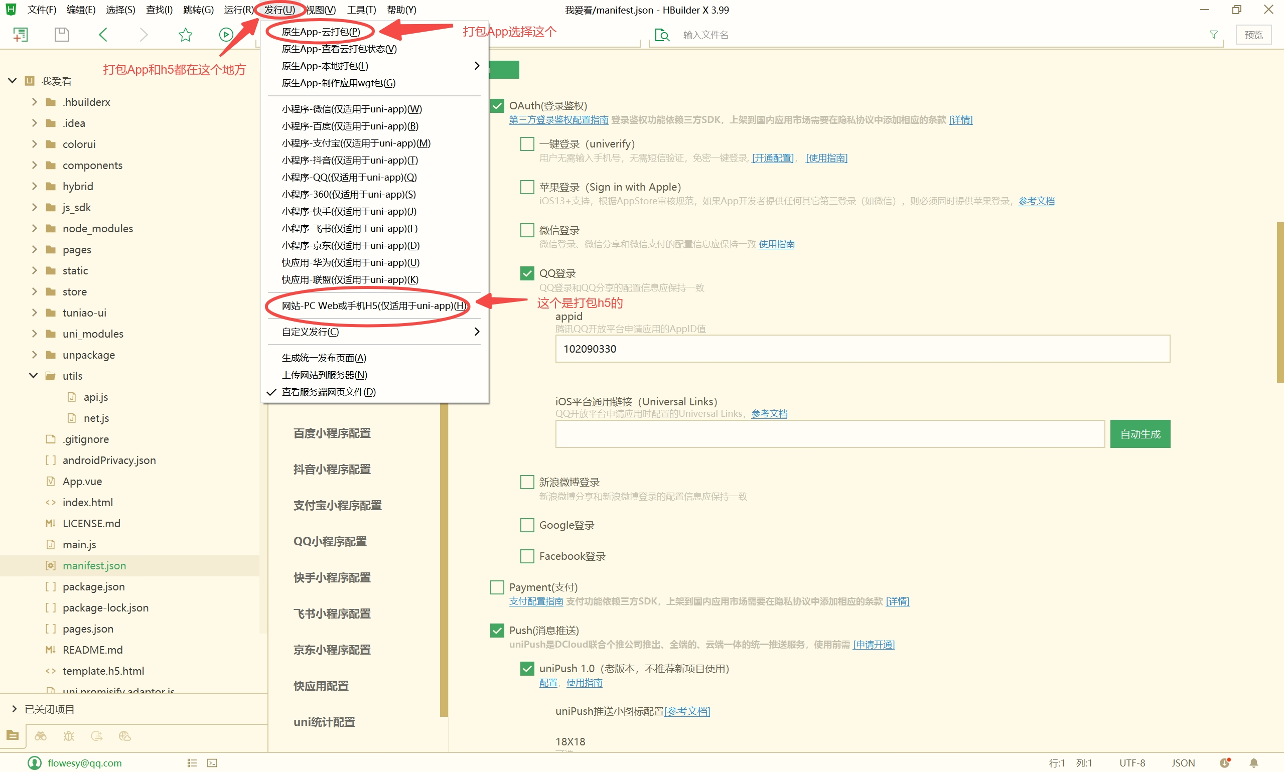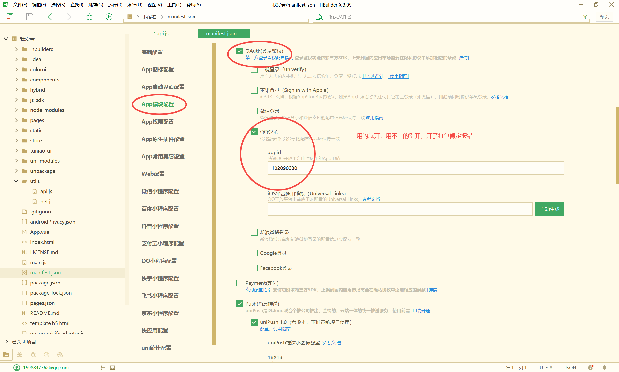 - 第三方登录 这里有个注意点就是,用的就开,用不上的别开,开了打包肯定报错。QQ微博微信这三个的,都去各自的开发者平台申请appid等信息,每个APP都是不一样的,具体的各自的开发者平台都有教程。