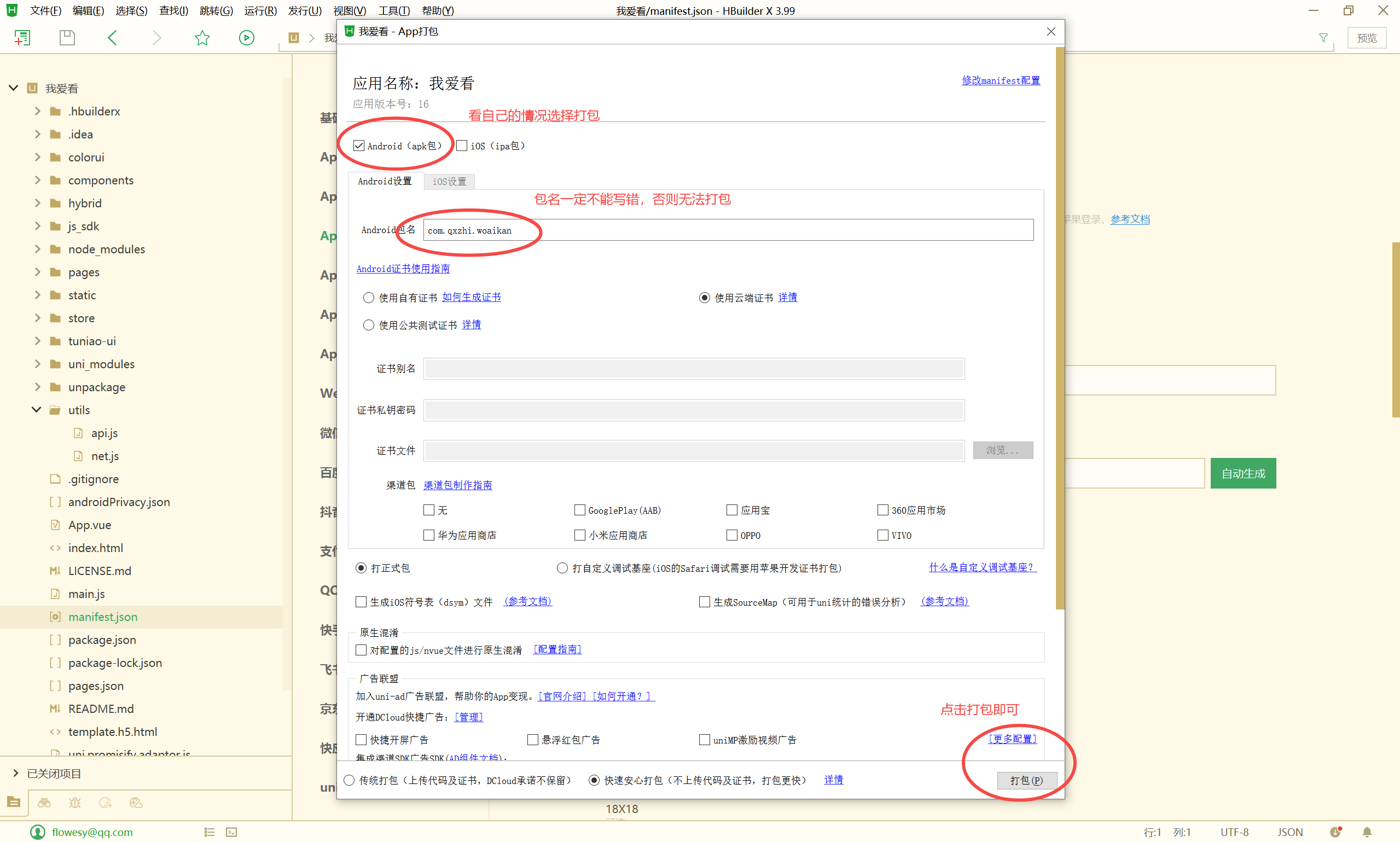 更详细的打包教程可以参考dcloud打包教程