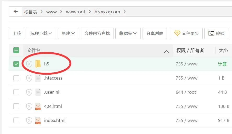 - 进网站目录新建一个名为“h5”的文件夹并进入,上传刚才生成的源码